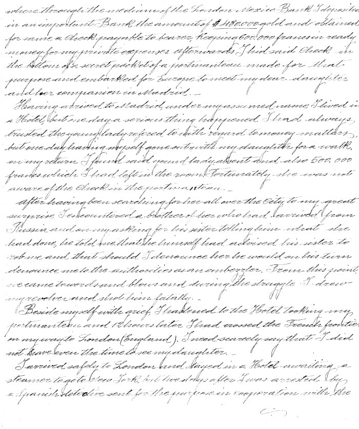 Yesterday, however a Spanish Inspector accompanied by two officers from Scotland Yard and acting under instructions of the Spanish Ambassador, who had previously interviewed the Home Secretary, arrested him on his way from the Hotel where he was staying, to the Steamship office. It seems that it was his evident intention to take passage for New York. From information received by the Ambassador, he had been in hiding in Spain, where he lived with a woman and with his daughter. A few days before arriving in London he had quarrelled with another Russian who was mortally wounded by a revolver shot during the scuffle and who only lived long enough to denounce his assailant.